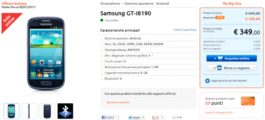 In ogni modo, se volete acquistare il Galaxy S 3 Mini, ecco l'occasione che aspettavate: anzichè 450€, lo potete comprare online su MarcoPolo Shop a soli 349€, con uno sconto di 100€. Non male, vero?