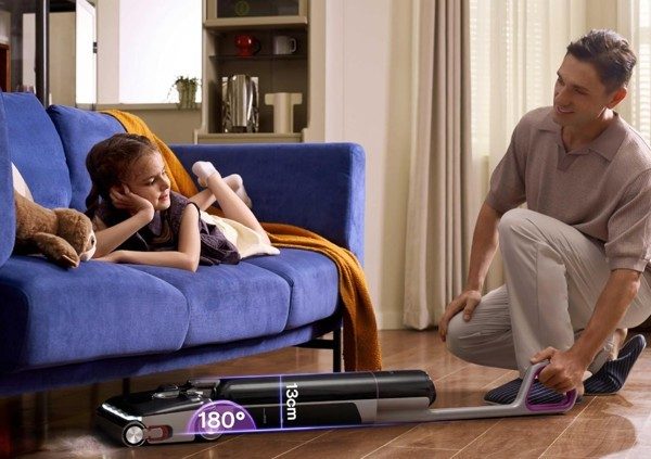 Il Design Slim con Inclinazione a 180° permette di scivolare facilmente sotto mobili bassi, come letti e divani, raggiungendo angoli impossibili. La base utilizza acqua ad alta temperatura per lavare e sanificare il rullo, mentre il sistema antigroviglio con 104 pettini in acciaio cattura i peli continuamente.