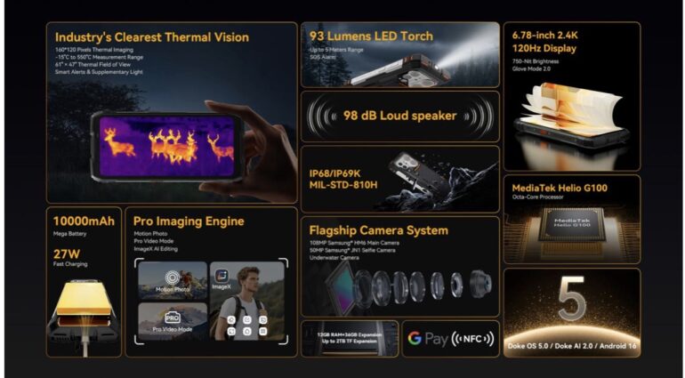 Pensato per ispezioni tecniche, manutenzione, sicurezza, cantieri e attività outdoor, il PILOT 6 integra tecnologie avanzate come la termocamera professionale, una fotocamera da 108MP, una batteria da 10.000mAh e il sistema DokeOS 5.0 basato su Android 16 con intelligenza artificiale.