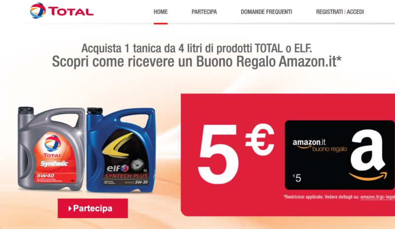 Total ed Elf ti regalano un buono Amazon da 5€. Scopri come ottenere un buono Amazon in modo semplice e veloce acquistando una tanica di lubrificante