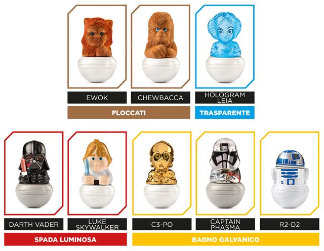 La raccolta include 32 personaggi, di cui 23 normali e 8 leggendari e uno Yoda gommoso. Quest’ultimo non sarà consegnato in cassa in una normale bustina e si otterrà solo con l’acquisto di 25 euro in prodotti della linea Esselunga CheJoy.