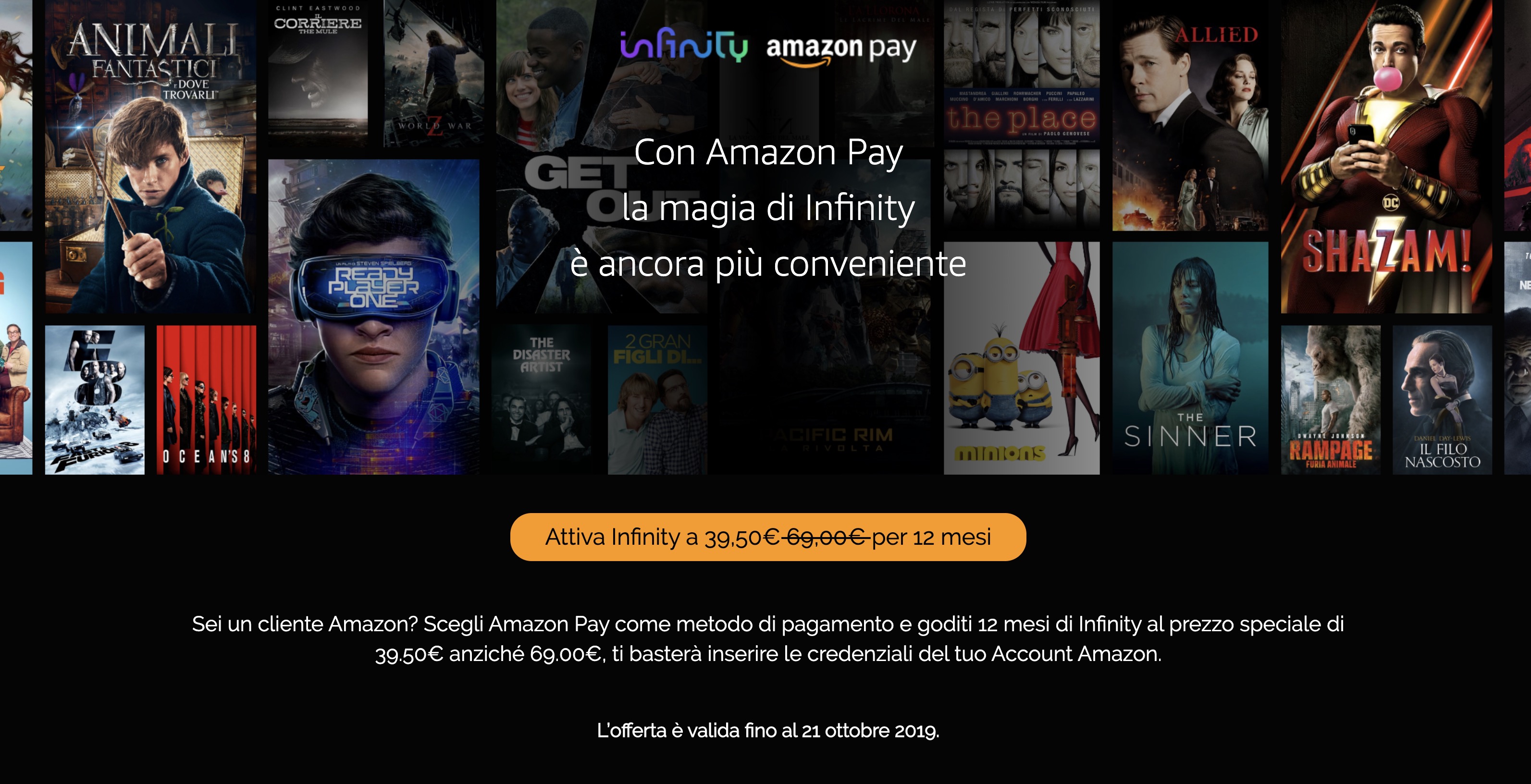 Come avere Infinity per 12 mesi a solo 39.50 pagando con Amazon Pay. Fino al 21 ottobre puoi risparmiare 30€ sull’abbonamento Infinity per 12 mesi: ecco come