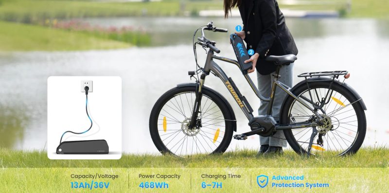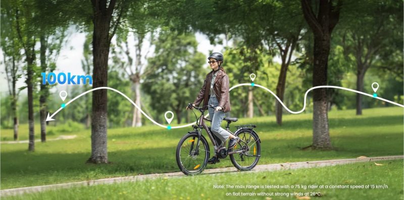 - Autonomia fino a 100 chilometri: grazie a una batteria da 36 V e 13 Ah, ideale per lunghi tragitti. Il tempo di ricarica completo è di circa 6-7 ore