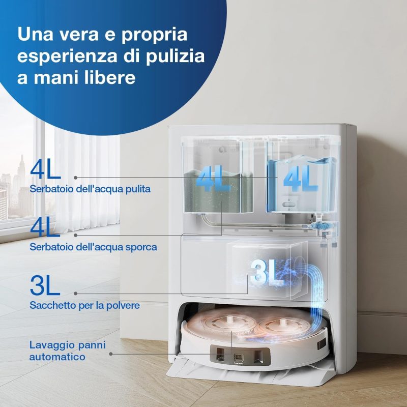 La stazione COMBO All-in-One della famiglia è dotata di una funzione di doppio svuotamento automatico sia per l'aspirapolvere portatile che per l'aspirapolvere robot. Ciò consente inoltre di lavare facilmente i moci ad alta temperatura con acqua calda a 70°C.