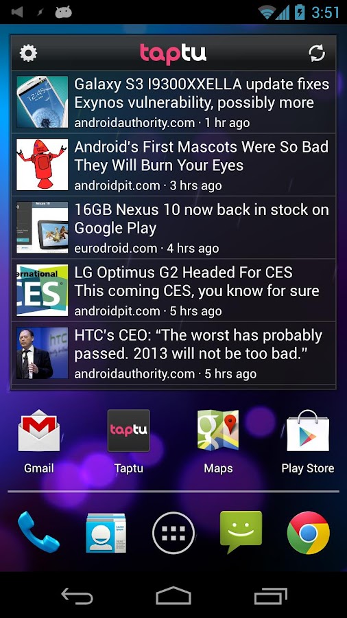 L'ho scoperto solo di recente, ma da allora lo utilizzo con regolarità. Taptu è un lettore di notizie preferite in un'unica app. E' possibile aggiungere i tuoi siti e blog preferiti come i Feed RSS e i social network come Facebook o Twitter trasformandoli in flussi di notizie. I widget sono poco personalizzabili ma sono davvero utili per tenere sotto controllo le vostre notizie. E' gratuito.