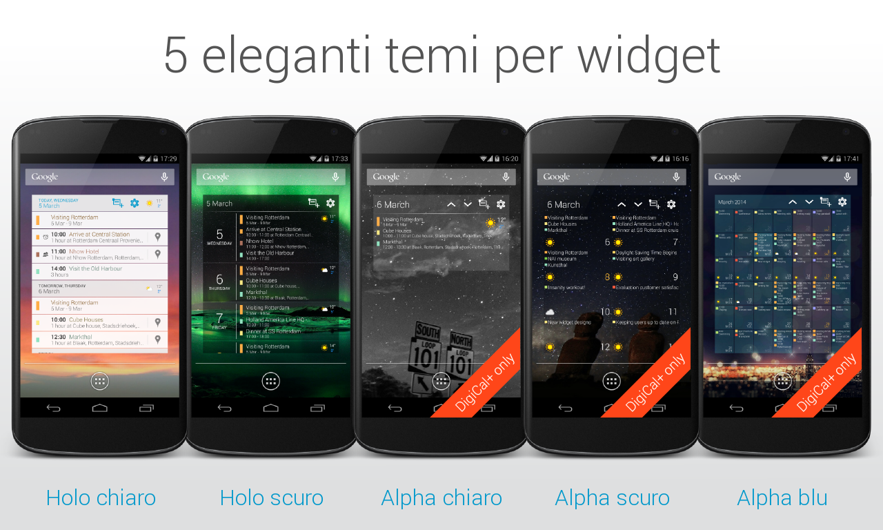 Utilizza il calendario Android più elegante, con 6 stupende skin e 6 bellissimi widget per la lock-screen. Ora anche con le previsioni meteo ed in Italiano. Sono disponibili widget con trasparenze e colori ad effetto. E' il miglior widget calendario presente sul Play Store. E' a pagamento anche se i widget aggiuntivi non sono personalizzabili più di tanto.