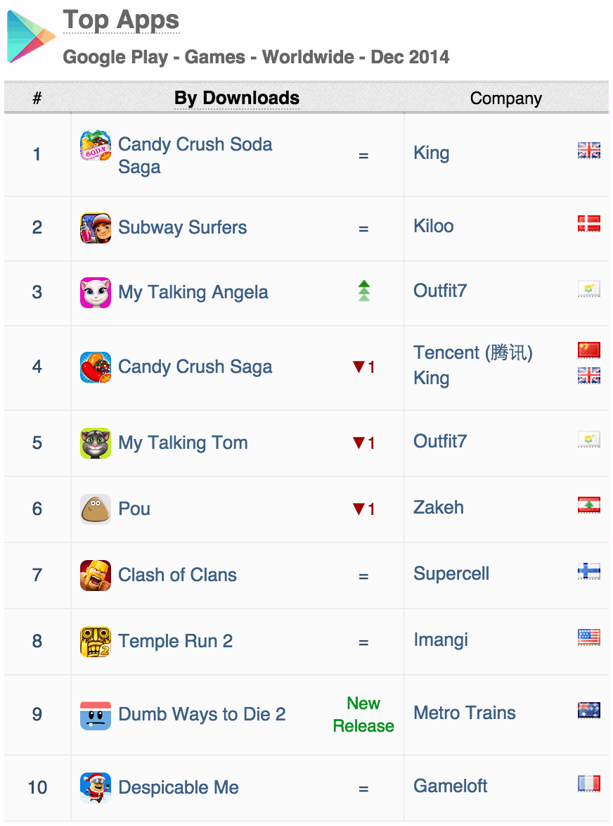 App Annie, ogni mese stila una classifica delle app più scaricate, e questa volta è il turno del mese di Dicembre 2014, quello che ha chiuso un 2014 scoppiettante per il mondo Android. Nella categoria giochi troviamo, re incontrastato Candy Crush Soda Saga, seguito da Subway Surfers e My Talking Angela, fuori dal podio c'è Candy Crush Saga e My Talking Tom.
