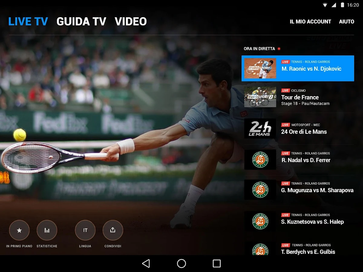 Eurosport Player è disponibile per dispositivi Android. Eurosport vi ricordo che è un servizio di abbonamento che permette di godere pienamente e con accesso illimitato ai canali di di sport a 360 gradi ed ai contenuti esclusivi LIVE e on-demand. Con l'applicazione potrai ottenere l'accesso illimitato a Eurosport e Eurosport 2 in Live streaming ad alta qualità, approfittare di una ricca offerta di contenuti esclusivi in diretta fino a 7 incontri di tennis contemporaneamente per il Grand Slam ma anche la 24 Ore di Le Mans, con la possibilità di scegliere diverse angolazioni della telecamera per un'esperienza totalmente coinvolgente, con gli avvisi Live e i replay istantanei, affinare le tue competenze con le statistiche e le notizie in tempo reale.