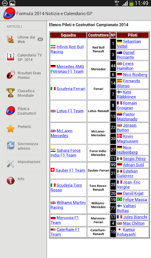 Formula 2014 è un'applicazione gratuita ed Italiana che permette di seguire la Formula 1 in diretta dal tuo smartphone Android. Formula 2014 è l'applicazione per tenersi aggiornato sul campionato di Formula 1, informandoti sulle ultime news dei piloti, gare, trasferimenti e team del 2014 ed è ottimizzato per risoluzioni HD.