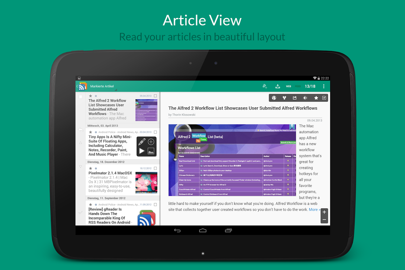 E' il mio lettore feed RSS preferito, gReader lo uso da tantissimi anni e nelle ultime versioni è diventato ancora più semplice, veloce ed intuitivo. gReader per Android supporta i temi, i podcast e la lettura offline. Leggi tutte le notizie tramite il miglior aggregatore RSS per Android. Lo avevo abbandonato per diversi anni, ma ora ho ripreso ad utilizzarlo dopo il down di feedly e devo dire che gReader Pro è migliorato tantissimo.