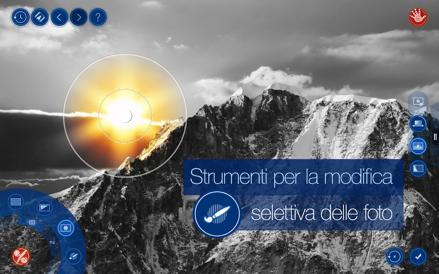 - Regolazioni tonali e cromatiche a livello globale e locale Migliora l'aspetto generale delle tue foto apportandovi correzioni tonali e cromatiche sia globalmente che localmente. Basta strisciare un dito e toccare lo schermo un paio di volte per trasformare le immagini in opere d'arte vivide e intense.