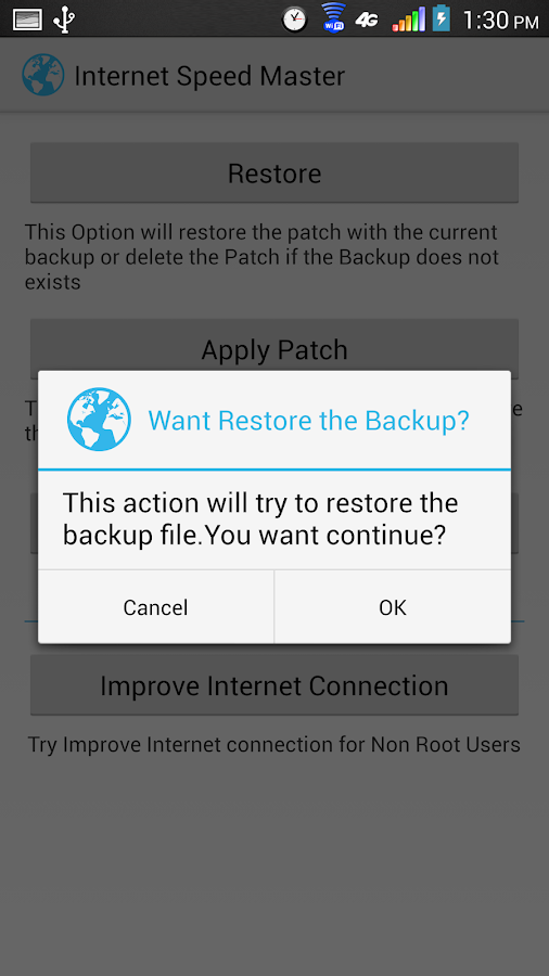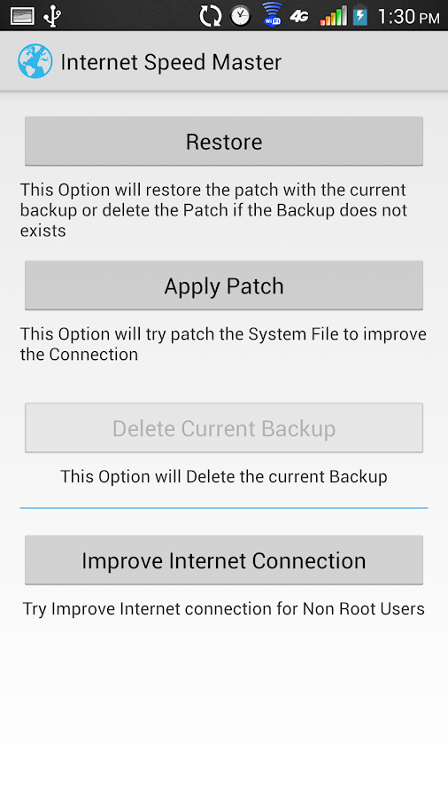 Gli utenti senza ROOT vedranno la funzione di patch disabilitata e dovranno toccare 'Migliorare la connessione Internet' che si trova in basso. L'applicazione non richiede conferma prima di eseguire questa modifica. Per ripristinare tutto come prima basta toccare Restore seguito da OK, dopo di che l'app ripristinerà il file stock dal backup e cancellerà la patch se non esiste un file di backup.