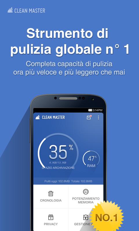 Clean Master (Speed Booster) è la migliore app per Velocizzare AndroidClean Master è l'app per Android più affidabile al mondo per velocizzare il nostro smartphone o tablet in modo rapido e veloce eli...