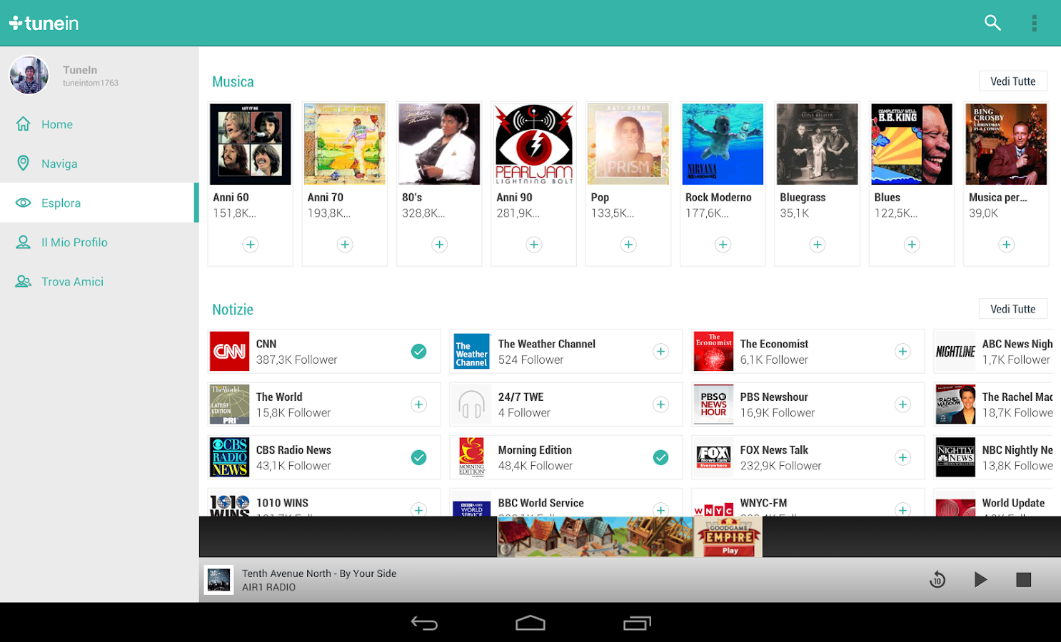 Iniziao da TuneIn Radio perchè è la mia preferita. E' possibile ascoltare tantissime internet radio, podcast e tantissimi canali, sono oltre 100.000 le fonti disponibili, in pratica si trova di tutto. Interfaccia grafica semplice ed intuitiva. E' disponibile sia nella versione gratuita ma quella a pagamento non ha nulla di più di quella gratis, le funzioni base ci sono tutte.
