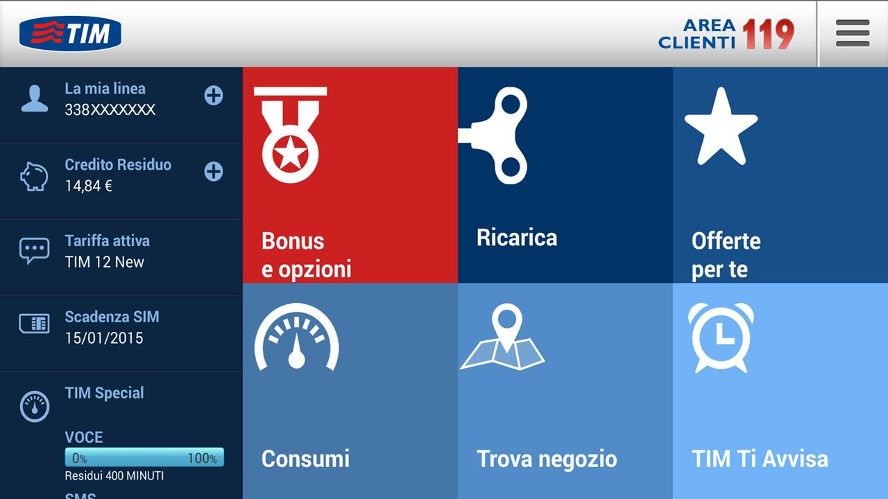 119 è l'applicazione ufficiale di TIM che permette di gestire al meglio la tua linea telefonica. Ovunque tu sia, avrai sempre a disposizione le informazioni su il tuo Credito residuo (per le TIM Card Ricaricabili) o saldo del bimestre in corso non ancora fatturato (per gli abbonati), Piano tariffario e scadenza SIM (per le TIM Card Ricaricabili), Avanzamento del consumo del traffico incluso nelle tue offerte attive (per alcune offerte anche in formato grafico), Dettaglio del traffico ma anche Ricaricare il tuo credito residuo o quello di un’altra utenza con Carta di Credito (anche memorizzando i dati della carta per alcuni circuiti), con PayPal o con RICARICard (per le TIM Card Ricaricabili), Visualizzare le informazioni relative a tutte linee TIM a te intestate e associate precedentemente sul sito tim.it (voce menu “Le tue SIM”), Trovare il negozio TIM più vicino, Contattare gli operatori 119 attraverso la sezione “Twitter”, Attivare le offerte selezionate da TIM appositamente per te (il pagamento avviene con scalo da credito residuo per i Clienti con utenze ricaricabili e con addebito in bolletta per i Clienti con utenza in abbonamento) ed Attivare e gestire il servizio “TIM Ti Avvisa” per tenere sotto controllo le tue offerte attive.