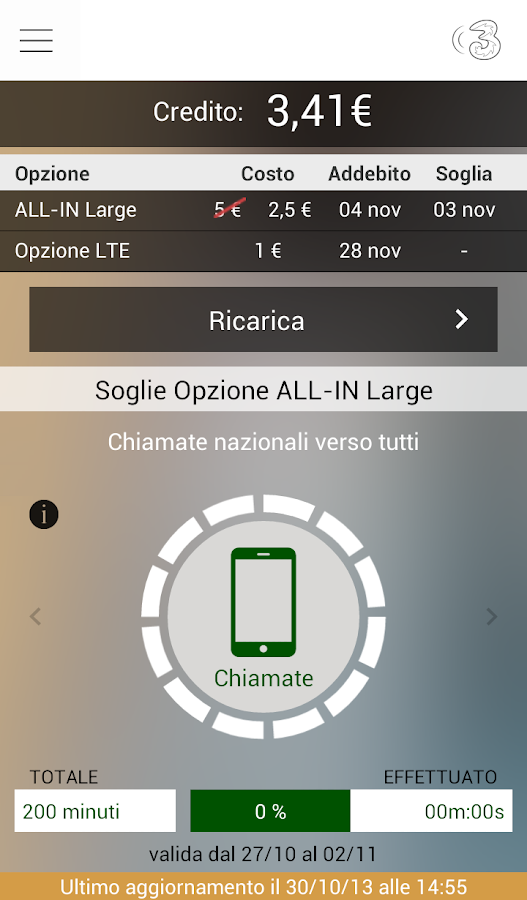 Con AreaClienti 3 puoi visualizzare il credito residuo, le opzioni con giorno di rinnovo e addebito costo e le soglie previste dalla tua offerta. Hai inoltre la possibilità di ricaricare in qualsiasi momento. Il nuovo sistema di smart alerting ti avvisa quando il tuo credito non è sufficiente per il rinnovo delle opzioni. Ricaricare con una Ricarica 3 oppure con carta di credito e per impostare il servizio di Ricarica periodica. Opzioni e Servizi: per gestire le opzioni della tua offerta e per disattivare i servizi in abbonamento. Contattaci: per chiederci assistenza scegliendo gli argomenti di tuo interesse fra quelli proposti e visualizzando immediatamente le risposte. Se non trovi la risposta che stai cercando scrivi il tuo messaggio specifico e verifica domanda e risposta nella sezione dedicata. Grande Cinema 3: per richiedere e attivare la card che ti permette di andare al cinema, il biglietto lo paga 3.
