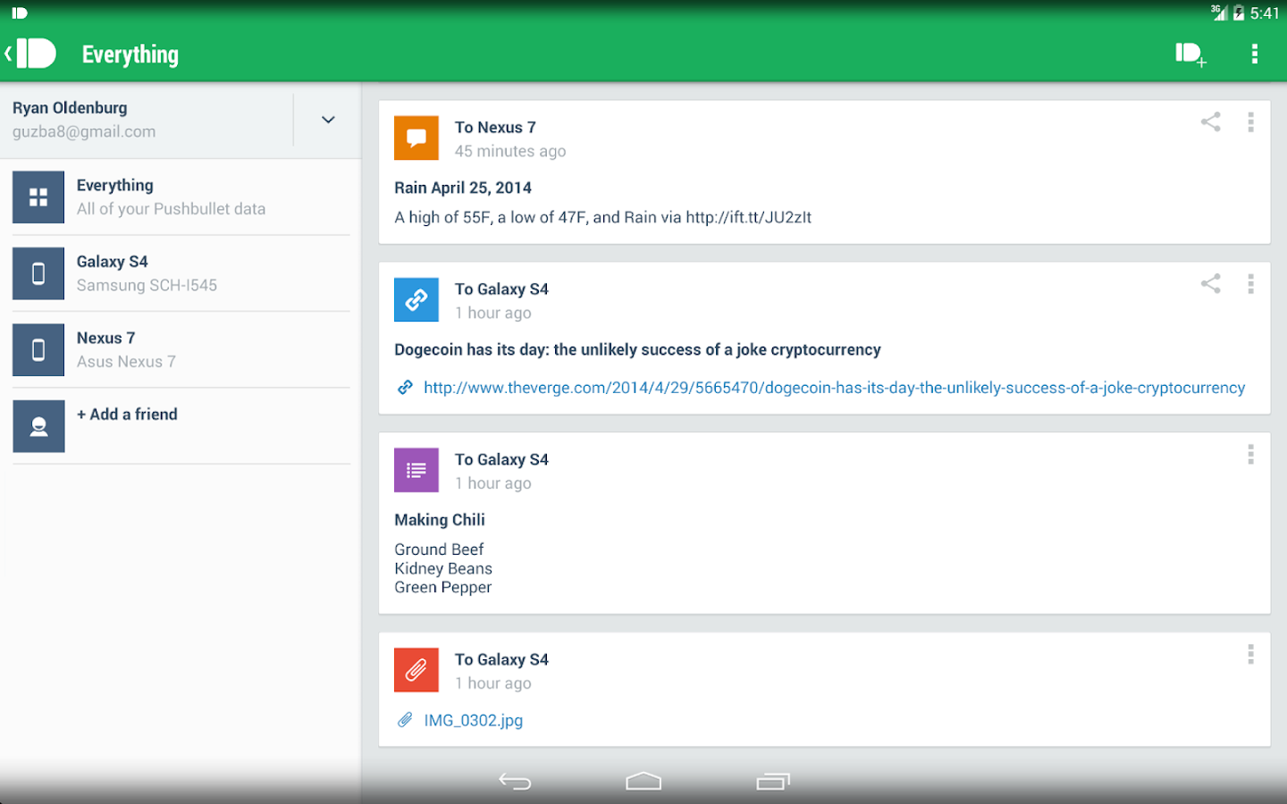 Con Pushbullet puoi inviare link, immagini, file, elenchi, note e altro ancora dirittamente al tuo telefono, al tuo computer oppure ad un amico, velocemente.