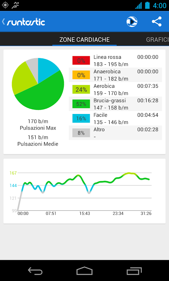 - Allenamento tramite zone cardiache ed analisi: Scegli una zona cardiaca da monitorare ed ottimizza il tuo allenamento (es. zona dimagrante)