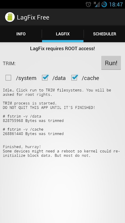 LagFix (fstrim) Free è una piccola applicazione che permette di andare a velocizzare sensibilmente il vostro smartphone Android. L'app richiede i permessi di ROOT per funzionare e va a modificare alcuni file di sistema che permette di velocizzare Android con un piccolo trucchetto.Molte memorie dei moderni smartphone supportano TRIM che è un problema comune su molti kernel Linux che permette di velocizzare sensibilmente i tempi di accesso alla memoria così da velocizzare tutte le operazioni di scrittura e lettura sulla memoria.