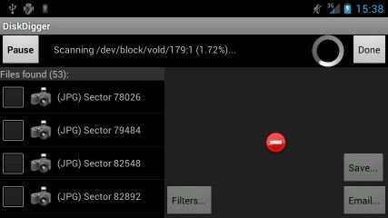 Dopo aver selezionato il dispositivo per la scansione, premere il tasto Scan device per procedere. Viene visualizzata la finestra principale di DiskDigger, che mostra l'avanzamento della scansione, così come i file recuperabili che sono stati trovati finora: