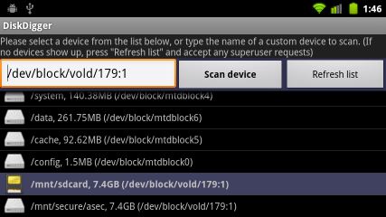 L'utilizzo di DiskDigger per Android è molto semplice. Dopo aver avviato l'applicazione, verranno visualizzati tutte le Memorie presenti nello Smartphone, compresa la Scheda di memoria, dove è possibile eseguire la scansione per recuperare i file persi. Verrà visualizzato l'elenco utilizzando i nomi dei dispositivi come su Linux (non molto visivamente accattivante, ma questo sarà migliorato in futuro). La scheda di memoria dovrebbe apparire come /mnt/sdcard o qualcosa di simile.
