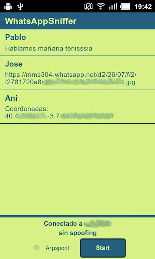 WhatsAppSniffer effettua esattamente quello che è stato descritto in precedenza, infatti con un Devices Android dotato di pemessi di ROOT basta installare l'applicazione dal Play Store e avviare la scansione che in automatico rileverà le conversazioni WhatsApp degli utenti presenti sulla stessa rete Wi-fi.