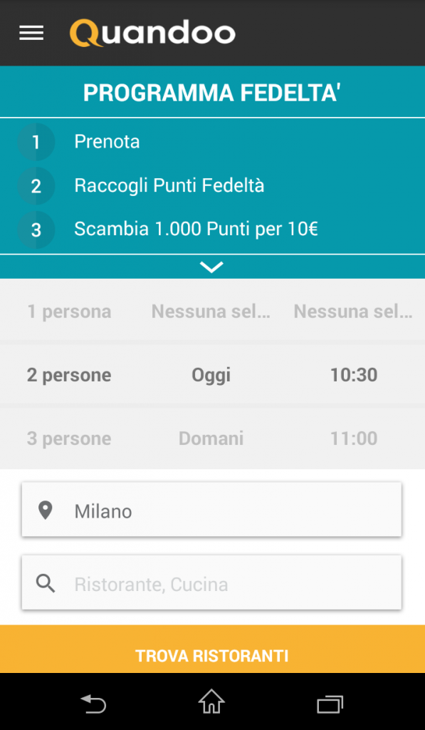 “La completa soddisfazione degli amanti della buona tavola è da sempre al centro della filosofia di Quandoo.it, per questo proponiamo un servizio che garantisce accesso alla migliore qualità con il minimo sforzo” spiega Andrea Favarato, Managing Director & Co-Founder di Quandoo Italy. “L’App di Quandoo risponde al desiderio di essere sempre presenti per i nostri utenti, supportandoli nella scelta del ristorante ovunque si trovino, preoccupandoci di aiutarli a risparmiare tempo ed evitare seccature attraverso un servizio semplice, rapido e gratuito, che premia la fiducia e la fedeltà che ci dimostrano ad ogni click”.