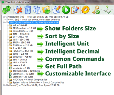 1Tree analizza i nostri hard disk o memorie esterne in tutte le sue cartelle, sotto-cartelle e file (filtrandoli in base alle dimensioni) e fornisce un accesso rapido ai comandi più comuni come Elimina, Sposta) e alcuni comandi particolari (ad es. la copia del percorso completo) per unità / file / cartelle. Ideale per effettuare manualmente la pulizia del disco per scoprire quali file occupano più spazio.