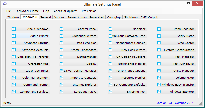 Una soluzione completa per molte opzioni di configurazione in Windows, Office e Configuration Manager. Questa versione adesso ha 13 diversi tab di configurazione compresi Windows 8 e un totale di 237 voci di configurazione su tutte le versioni di Windows, Powershell, Outlook, Server Administration e Configuration Manager. Ultimate Settings Panel è una utility basata sui tab che ti da la possibilità di selezionare da un'ampia gamma di diverse opzioni di configurazione.