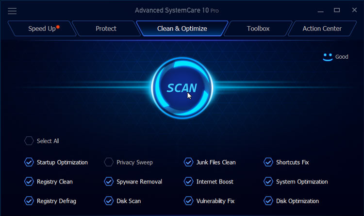 Advanced SystemCare Pro 10 è una utility per l'ottimizzazione facile da usare e completa, che con un solo click pulisce, ottimizza, accelera e protegge il tuo sistema e tiene persino al sicuro la tua privacy online. Con il tab aggiunto di recente Speed Up, accelera il tuo sistema, il tempo di avvio del sistema, dischi e browser. Inoltre, ricostruisce e migliora oltre 10 tool utili come Startup Manager, Performance Monitor, Large Files Finder, Auto Shutdown, Win Fix per esplorare il pieno potenziale del tuo PC.