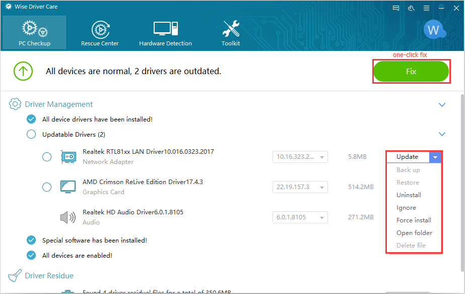 Wise Driver CareWise Driver Care ProScan & Update Outdated, Missing & Faulty Drivers V VHuge Database Support V VSafer Updating with WHQL Drivers V VBackup & Restore Drivers V VIncrease System Performance & Stability V VHigher Driver Download Speed VDriver Updates notification VAuto Create System Restore Point when Updating VOne-Click to Update All Drivers VClean Up Driver Residue VAuto Update to the Latest Version VPremium Tech Support V