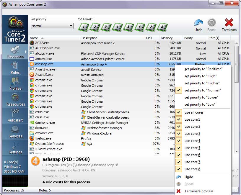 Gli utenti esperti possono creare facilmente profili individuali adatti a vari scopi, come per esempio giocare con il computer. Con Ashampoo Core Tuner 2 potrete inoltre ottenere una chiara visione della distribuzione dei carichi di lavoro in tutto il sistema. Ci sono valutazioni dettagliate e funzioni per la regolazione dei servizi e le voci di avvio automatico.