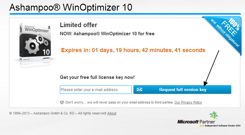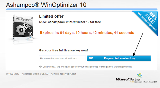 Per ottenere una licenza gratuita di Ashampoo WinOptimizer 10, andare in questa pagina e inserire la vostra e-mail entro e non oltre il 31 Ottobre 2013.