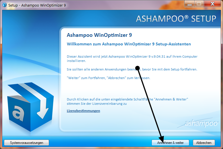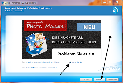 Durante l'installazione, Ashampoo WinOptimizer 9 tenta di scaricare ed installare un programma di terze parti a pagamento. Cliccare "NO".