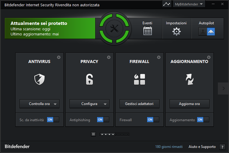 Bitdefender Internet Security 2014 è una suite di sicurezza in grado di proteggere voi e la vostra famiglia dagli attacchi invisibili da tutte le angolazioni - da internet, e-mail, social media, unità USB, periferiche collegate in rete e chat. Esso consente di visualizzare lo stato di protezione corrente dell'antivirus, firewall e moduli antispam, mentre gli aggiornamenti vengono applicati automaticamente a intervalli regolari (c'è anche una opzione manuale per verificare la presenza di nuovi aggiornamenti e installarli all'istante).