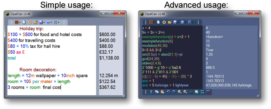 OpalCalc è un nuovo tipo di calcolatrice per il PC. Facile da usare come Notepad oppure come un elaboratore di testo, OpalCalc permette il linguaggio naturale nella somma e supporto multi righe, in modo tale che tu possa tornare e aggiornare i tuoi calcoli precedenti al volo.