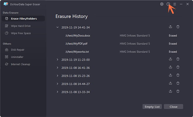 DoYourData Super Eraser allows you to check, empty or export erasure histroy.