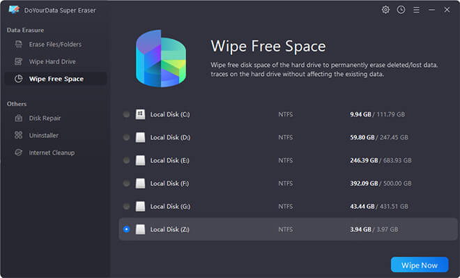 DoYourData Super Eraser offre una soluzione sicura per i dati per cancellare in maniera permanente i dati dall'hard drive oppure dai supporti di memoria. Ti permette di cancellare i file/cartelle, pulire l'intero hard drive/dispositivo. È in grado di pulire lo spazio del disco inutilizzato per cancellare in maniera permanente i dati cancellati/smarriti sull'hard drive.