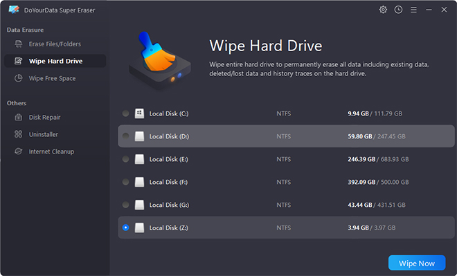 Steps: select mode “Wipe Hard Drive” --> select the partition or device you want to wipe --> click on “Wipe Now” button to start wiping all the data on the partition or device.