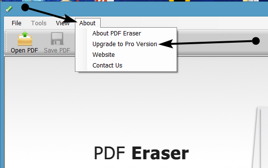 Dopo aver scaricato ed installato PDF Eraser Pro, avviatelo e inserite il codice sotto la voce About e Upgrade to Pro Version.