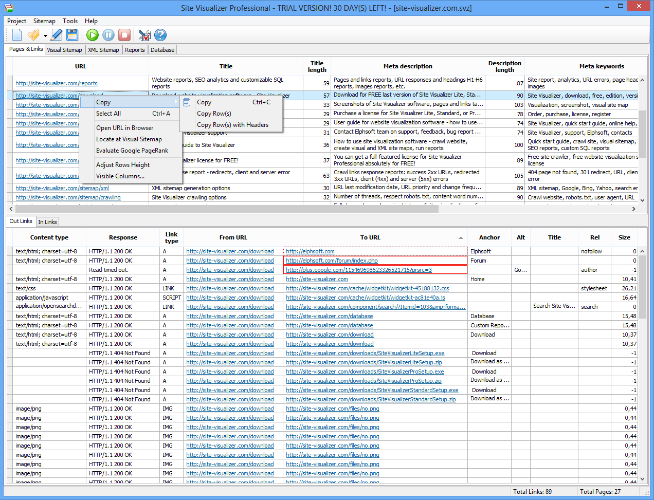 Site Visualizer è uno strumento che visualizza la struttura di un sito web e lo visualizza come un insieme di pagine con i loro link in entrata e in uscita. Il crawler raccoglie tutti i parametri SEO connessi di ogni URL all’interno del sito. I dati possono essere presentati sotto forma di tabella, di mappa del sito, di report o sitemap XML.
