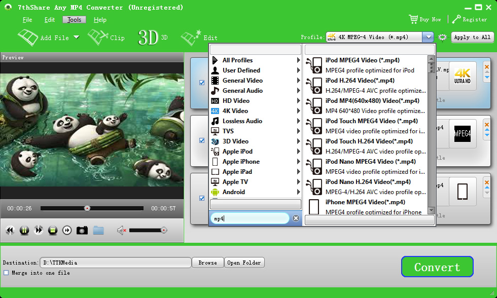 7thShare Any MP4 Converter è in grado di convertire FLV, MKV, WMV, MOV, MTS e altri formati video in MP4, un formato ampiamente accettato che funziona sulla maggior parte dei dispositivi elettronici. Diversi formati di codifica MP4 sono disponibili, compresi video HD MPEG-4 Video (*.mp4), video HD H.264/MPEG-4 AVC (*.mp4), Samsung Galaxy Note (*.mp4), iPhone H.264 HD Video(*.mp4), YouTube HD Video (*.mp4), e molti altri.