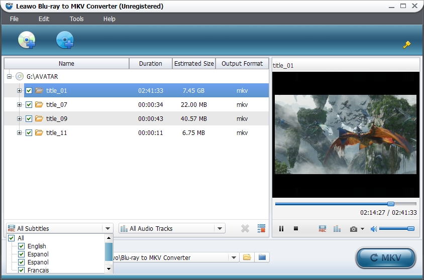 Leawo Blu-ray to MKV Converter è un programma professionale per il ripping e la conversione di Blu-ray e DVD in MKV. Grazie al suo supporto per i sistemi anticopia, Leawo Blu-ray permette di decifrare facilmente Blu-ray con AACS, BD + e il nuovo MKB più i DVD-CSS. Oltre le capacità avanzate di conversione, questo convertitore di Blu-ray in MKV può anche generare file MKV con qualità lossless. Permette inoltre di conservare più sottotitoli e tracce audio dai Blu-ray di partenza, visualizzare anteprime dei contenuti di Blu-ray/DVD, catturare screenshot, visualizzare anteprime di sottotitoli e tracce audio di output, rinominare il file di output e molto altro ancora.
