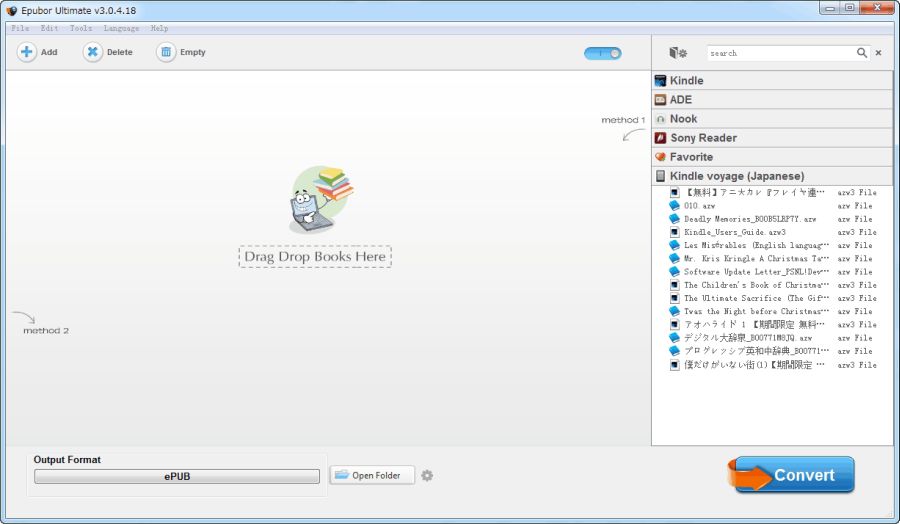Converte eBook e rimuove DRM. Il migliore del settore: può decifrare e convertire eBook acquistati da Amazon Kindle, Kobo, Sony, Google Play, Barnes & Noble Nook, Smashwords e librerie pubbliche. Ultimate eBook Converter permette di convertire eBook nei formati più comuni come ePub e Mobi partendo dai PDF ma anche rimuovere i DRM che proteggono gli eBook dalla distribuzione. Potrete convertire gli eBook per tutti gli eBook reader in commercio come i puù comuni Amazon Kindle e Kobo.