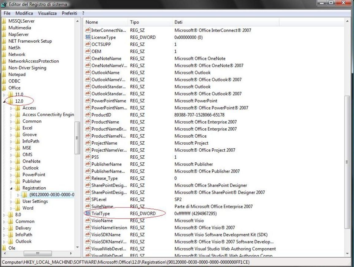 - Nel Regedit dirigetevi alla voce HKEY_LOCAL_MACHINE -> Software -> Microsoft -> Ufficio -> 12,0 -> registrazione