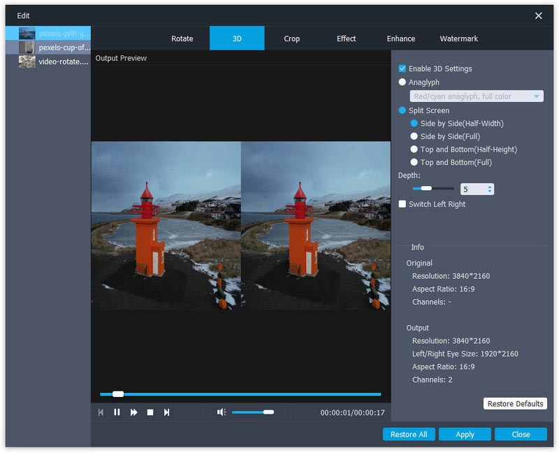 Inoltre, non puoi perdere le sue potenti funzioni di editing per tagliare, ritagliare, ruotare, effetto specchio, aggiungere il watermark, combinare e abilitare il 3D per file media sul computer direttamente. Sottotitoli supplementari e traccia audio sono anche altamente supportati da questo tool.