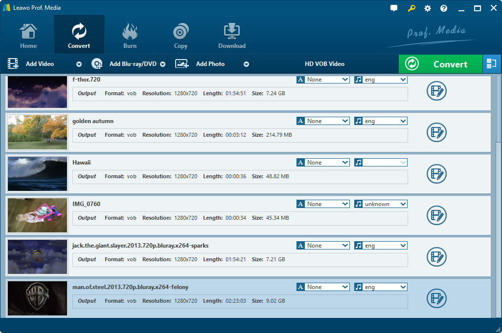 Leawo Video Converter è la soluzione ideale per convertire sia i video HD che i video standard in modo semplice. Permette di convertire i video HD, i video standard e i file audio tra diversi formati, come AVI, MP4, WebM, RMVB, RM, MPG, MPEG, VOB, MOV, M4V, FLV, F4V, MKV, FLAC, AAC, AC3, AIFF, AMR , M4A, MP2, MP3, ecc. L’applicazione permette di regolare vari parametri dei video, come dimensione dei file, qualità, codec video, bitrate, aspect ratio, frame rate, codec audio, canali audio, ecc.