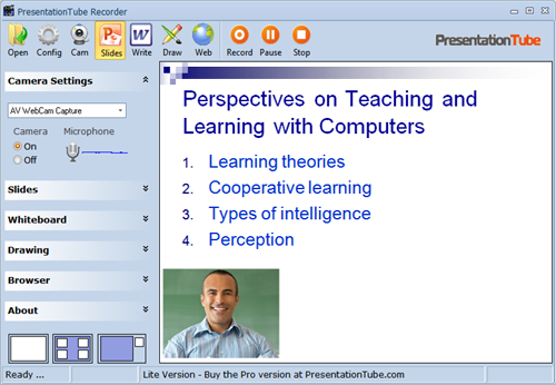 PresentationTube è un registratore di presentazioni video e una piattaforma di video sharing che aiuta insegnanti e studenti a produrre e condividere presentazioni video di alta qualità in un modo tutto nuovo. Il registratore consente ai relatori di inserire annotazioni e contenuti extra nelle diapositive di PowerPoint usando una vasta gamma di supporti visivi, quali webcam, lavagne elettroniche, tavolette grafiche, contenuti da browser Web e registrazioni del desktop.