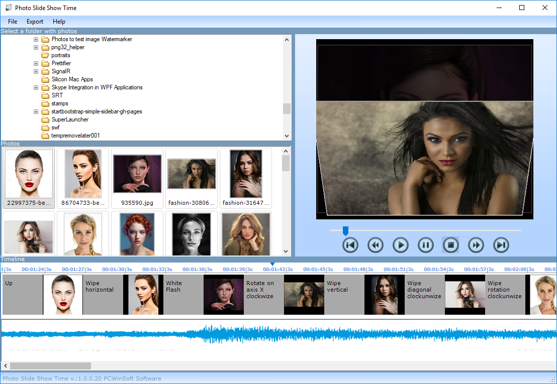 Photo Slide Show Time crea presentazioni di foto impressionanti, da raccolte di foto, scattate durante un matrimonio, un anniversario, o qualsiasi altro evento, durante il quale hai scattato delle foto. Photo Slide Show Time crea video di presentazioni di foto in tutti i formati più comuni come MP4, AVI, WMV, FLV, MKV, 3GP, MOV e molti altri.