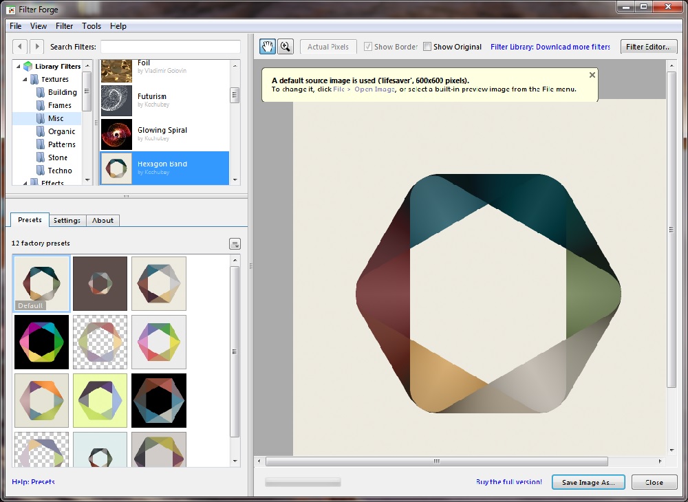 Filter Forge è un programma che permette agli artisti del computer di utilizzare e costruire i loro stessi filtri – texture uniformi, effetti visivi, distorsioni, pattern, sfondi, cornici e molto altro. Le caratteristiche principali di Filter Forge comprendono un editor di filtro visivo e una libreria online gratuita con oltre 11.000 filtri creati dagli utenti, a cui possono contribuire tutti. Funziona come un'applicazione stand-alone oppure come un plugin con un numero di host.